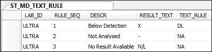 The rules for any given laboratory are defined via the ST_MD_TEXT_RULE table, for example.