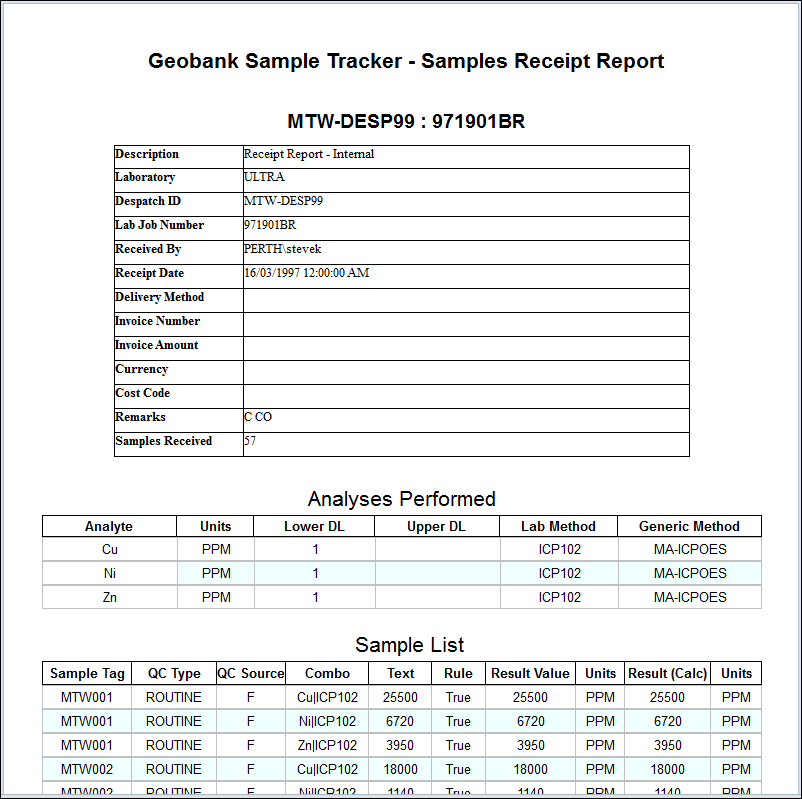 Finally, click Close in the Summary panel to complete execution of the receipt and generate a report. The report uses the Advanced Reporting module. If you have a licence for this module it is possible to create and use a customised version of this report.
