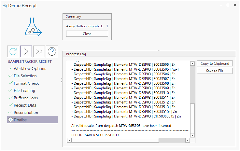 The Summary panel displays the number of Assay Buffers imported by the process. The Close button in the Summary panel will close the Receipt wizard.