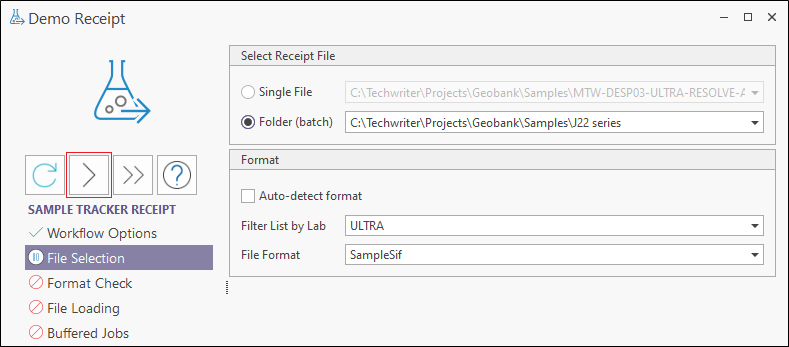 When the File Selection screen has been configured, click Next to proceed to the Format Check screen.