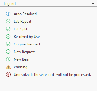 A Legend can be opened with the button at the right, showing the status for each returned sample. The Legend can be closed using the arrow at the top right.