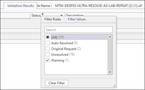 You can filter the results using the Filter icons available for each column. For example, set the Status column to filter for warnings: