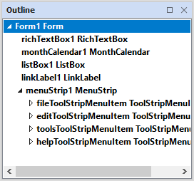 When you select a control in the Outline panel, it is selected in the form, and the properties of that control can be viewed and edited on the Properties tab. See: Properties.