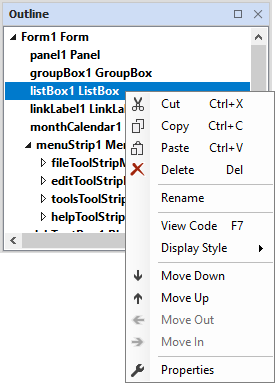 You can also copy, paste, configure, delete and interact with controls in the form with the right click menu for each entry in the Outline list.