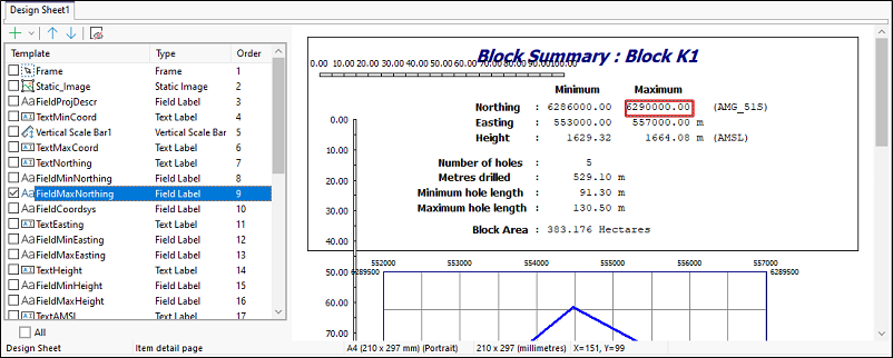 For example, you could use a simple field label to display the value of a given field (the drillhole number) from the collars dataset. The downhole lithological log, on the other hand, is best displayed as a graphic column, where each lithology code can be represented by a predefined hatch pattern. This graphic column can be scaled by way of a vertical scale bar, based on the depth range of each individual lithology interval.