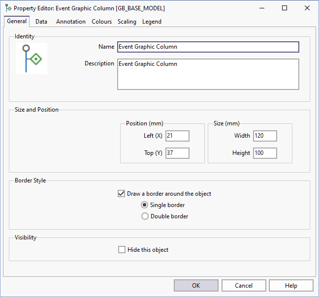 To change the properties of an Event Column, click on the event column template (either in the templates list or in the report) and select the File | Properties menu option to display the Event Column Property Editor. Alternatively right-click and select Properties from the right-click menu.