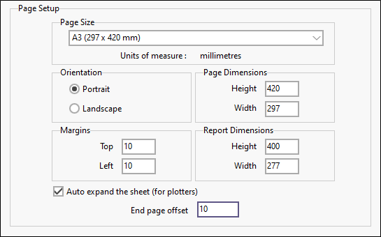 Set the page size and orientation and the width and height of the design sheet. You may require a different page orientation, margins, or sheet dimensions, for each section of the report (see below). For output to a plotter, you can also vary the page length.