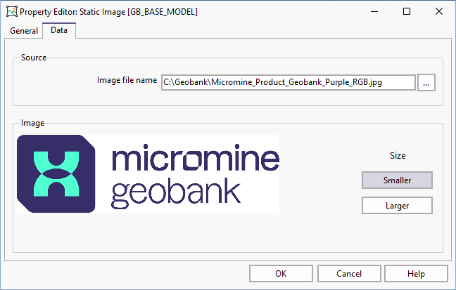 In the Data tab, specify the source of the image file by using the ellipsis button. Use the Smaller and Larger buttons provided to increase or decrease the display size of the image.