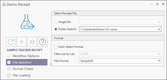 A receipt is configured for a specific laboratory and file format. These formats must be pre-configured in the Sample Tracker Metadata. In other words, once it is configured, a receipt can only be used to process result files from a specific laboratory and an associated lab file format.