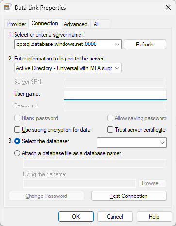 2. Select Use Windows NT integrated security to allow access to the database based on your windows login details. Otherwise provide the login User Name and Password needed to access the database.