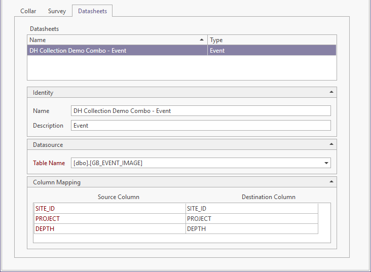 The Datasheets tab displays any events and/or intervals that are included in the collection for import. Datasheets represent the Event and/or Interval data for the drillhole collection.