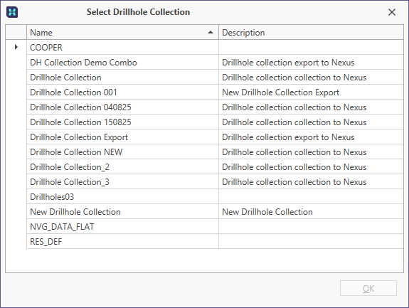 This will add the Nexus Workspace and Project name to your Drillhole Collection details and open the Select Drillhole Collection dialog:
