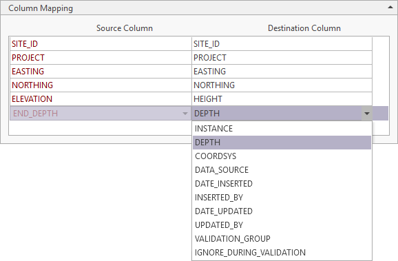 Source and Destination Columns in the grid are mapped from the Drillhole Collection you selected for the import. For imports, not every Source Column must be mapped. You can opt to not import certain data Source columns to a destination column if none are available.