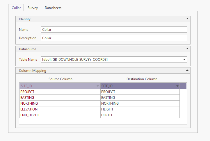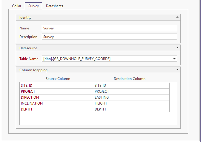 When the Collar data has been properly mapped, click the Survey tab to map the Survey data tables: