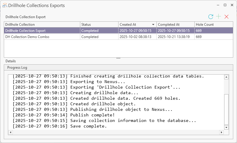 The Drillhole Collection Exports manager provides functionality to view the progress log details of your Drillhole Collection Exports, as well as Add and Delete collections.