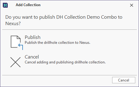 Note: Completed publish entries contain information on the entry in Nexus with which the drillhole collection is linked. Deleting completed entries will break the link with Nexus. If a user attempts to republish the drillhole collection for the deleted entry, an error will occur, as the collection Name exists in the Nexus project. To publish a deleted entry again, the entry in Nexus must first be deleted/removed. When the Nexus entry is removed, the drillhole collection can be published again. However, a new entry will be created in Nexus and not a new version of the previous collection. For more information, see the Remove topic in the Nexus Online Help via the link.
