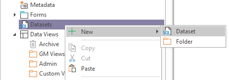 Alternatively, to create a database object only, you can right click on Datasets in the User Interface menu and select New | Dataset.