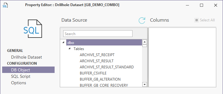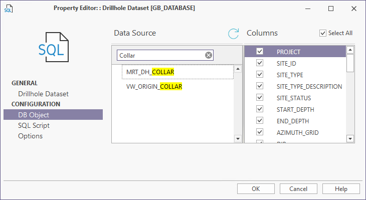 In the Data Source panel at the left, you can select the database table which contains the information for your drillhole dataset.