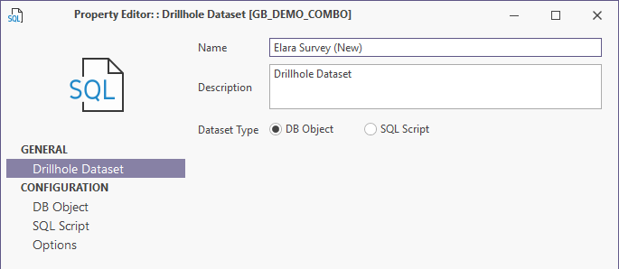 If your new drillhole dataset is to be built as a database object, select the option and then click the DB Object tab.