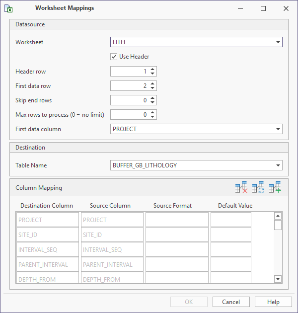 Use the Mapping form to map the rows and columns in each worksheet to the tables and columns of each datasource: