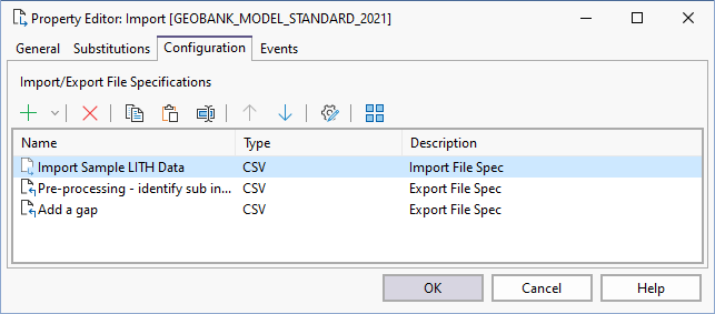 The Configuration page of the Property Editor allows you to combine several import and export file specifications into one process. For example, delete queries can be used to clear out temporary holding tables before they are populated via subsequent imports.