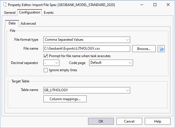 Use the Column Mappings option on the Data page of the Import File Spec Property Editor, to define the format of the columns in the destination table. New fields can be added to the import specification and fields in the input file can be omitted. Input field names can be changed, and field data type and width settings can also be adjusted.