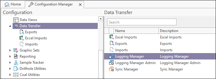 In the Configuration Manager, under Data Transfer, double click the Logging Manager option to open Logging Manager.