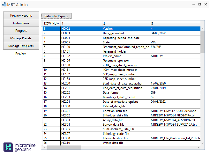 The Preview tab of the MRT Admin App contains a preview of the currently configured MRT report and selected template. The Preview tab is populated when clicking the Preview Template button on the Preview Reports tab.