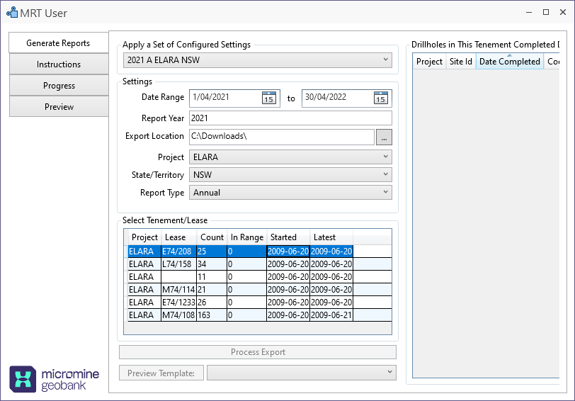 The Generate Reports tab provides configuration for the export of reports in the Mineral Reports Template format.