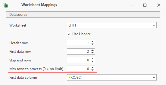 The Max rows to process option has been added to the Worksheet Mapping form for Excel Imports.