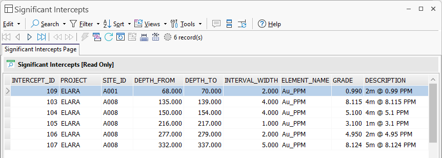 The Significant Intercept Data View has been added to support the reporting of significant intercepts for multiple minerals. A significant intercept is an interval with a grade within a specified cutoff range.