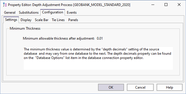 On the Settings page, specify the minimum allowable thickness after adjustment. The minimum thickness value is determined by the depth decimals setting of the source database and may vary from one database to the next. The depth decimals property can be found under Micromine Geobank Options on the Advanced page of the Database Connection Property Editor.