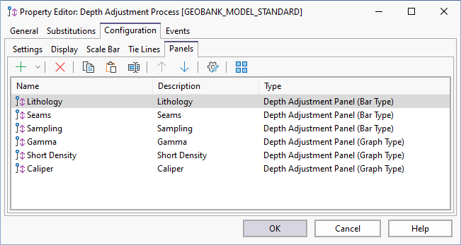 Use the Panels page to add panels to the depth adjustment layout and to configure the properties of each panel. Use the toolbar to add, delete, rename or arrange panels.