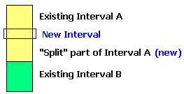 In addition to inserting the new interval (B), we need to split interval A into two parts, effectively adding a new "master" interval (C) and also building two new "detail" entries (CA and CB).