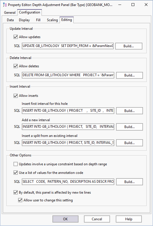This is why the INSERT action requires several SQL scripts. Depending on the type of data, there may be a subtle difference between the scripts used for INSERT NEW and INSERT SPLIT events. For example, when splitting a seam, the user will have to supply a code for the new “split” (by way of a standard Micromine Geobank substitution parameter dialog).