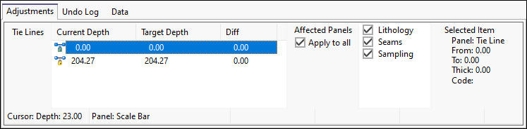 When a single tie line is applied, it will adjust only those depths (in the adjustable panels) that are exactly the same as the current depth setting for the tie line.