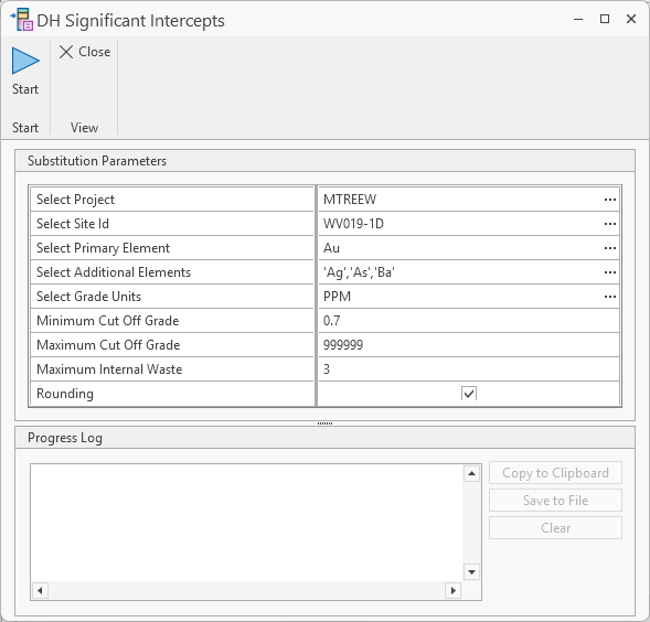 The Significant Intercepts tool is used to report on significant intercepts for multiple minerals. A significant intercept is an interval with a grade within a specified cutoff range.