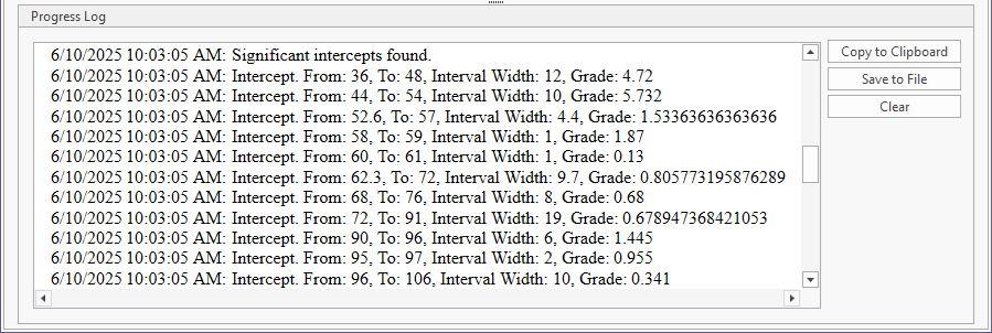 If any significant intercepts matching the report criteria are found, they are listed in the Progress Log panel: