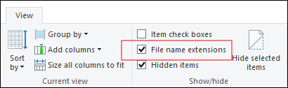 - In Windows Explorer, click on the View tab and make sure that the select File Extensions check box is selected. (this menu option may be named differently on older operating systems. If in doubt, ask your system administrator for help).