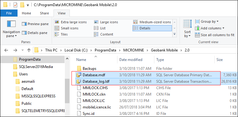 If you are running Windows 7, Windows 8 or Windows 10, the location of these working database files will be: C:\ProgramData\Micromine\Geobank Mobile\2.0.