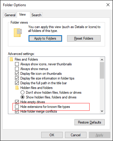 - Alternatively, click on the Options icon on the same tab, and make sure the Hide extensions for known file types option is not selected.