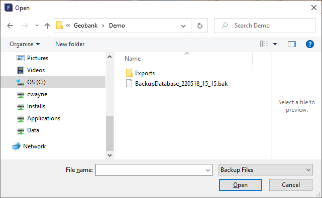 This menu option enables you to restore your working database from a previously created backup. You can use a backup you have previously created, or one of the automated daily/weekly/monthly backups generated by Micromine Geobank For Field Teams and saved to the folder:
