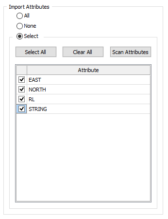If you have chosen to select the attributes you want to import, click the Scan Attributes button to populate the Attribute list. You can then use the check boxes, or click the Select All and Clear All buttons, to select and deselect attributes.