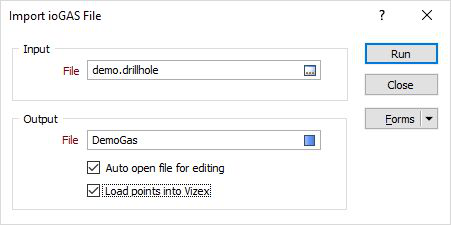 Data in the ioGAS .gas file is imported as point data, including symbol colour, shape and size fields. A built-in symbol set is provided to show symbols as they appear in ioGAS.
