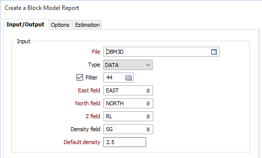 Enter a default Density value, expressed in tonnes per cubic metre (t/m3). Specific gravity values are also suitable for this purpose. If there is a Density field in the Input file, double-click to select the field. If a Density value is missing when a record is processed the default Density value will be used in its place. The Cumulative Density used in the Volume and Tonnage calculation is added to the output file. This enables the checking of the Density used to calculate the tonnage of different grade ranges.