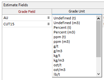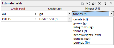 Note: You can select a field more than once provided that the mineral units for reporting are different. See: Estimate fields and how they are used