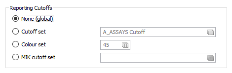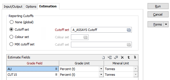 If you are using a MIK cutoff set, the Estimate fields grid must contain a single row. This is the field in which the e-type estimate is stored. This row is used only to define the field name and units. The Output file is modified to have a single Cutoff field rather than separate From and To fields. Cumulative statistics are not written to the file.