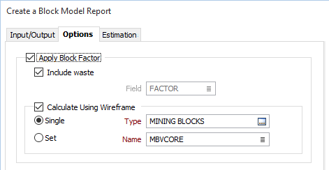 Select the Apply block factor check box to calculate block factors on-the-fly or select the field that contains the values for the portion of each block in the wireframe. When reporting estimates for block models that have been constrained and contain block factors, you can use the block factors to control the volume and tonnage that is reported.