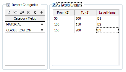 Select the Categorisation check box if you want to use one or more fields, the names of which must be specified in the Category fields list box, to categorise the reported grade estimates. For example, you might want to report estimates according to Material and then by Classification.