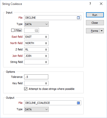 Because a distance tolerance is applied, the strings will be joined even if they are not touching. The function uses the spacing and orientation of the string ends to determine how they are joined. The use of a key field to separate different kinds of string is also supported.
